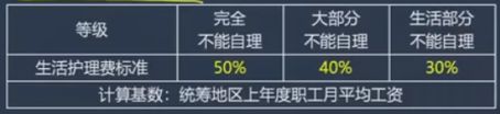 生活护理费按照生活完全不能自理、生活大部分不能自理或者生活部分不能自理3个不同等级支付,其标准分别为统筹地区上年度职工月平均工资的50%、40%或者30%。